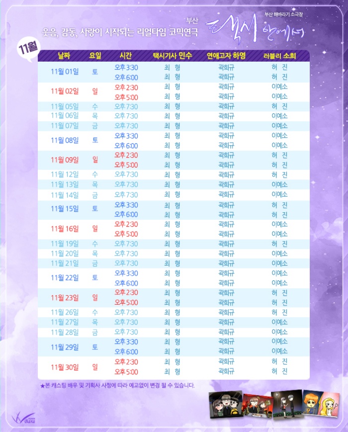 - 수~금요일 오후 7시30분 / 토요일 3시30분, 6시 / 일요일, 공휴일 2시30분, 5시 (월, 화요일 공연없음)