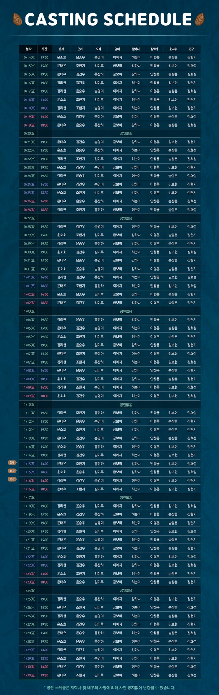 - 화, 목, 금 오후 7시30분 / 수 3시, 7시30분 / 주말 및 공휴일 2시, 6시30분 (월 공연없음)
