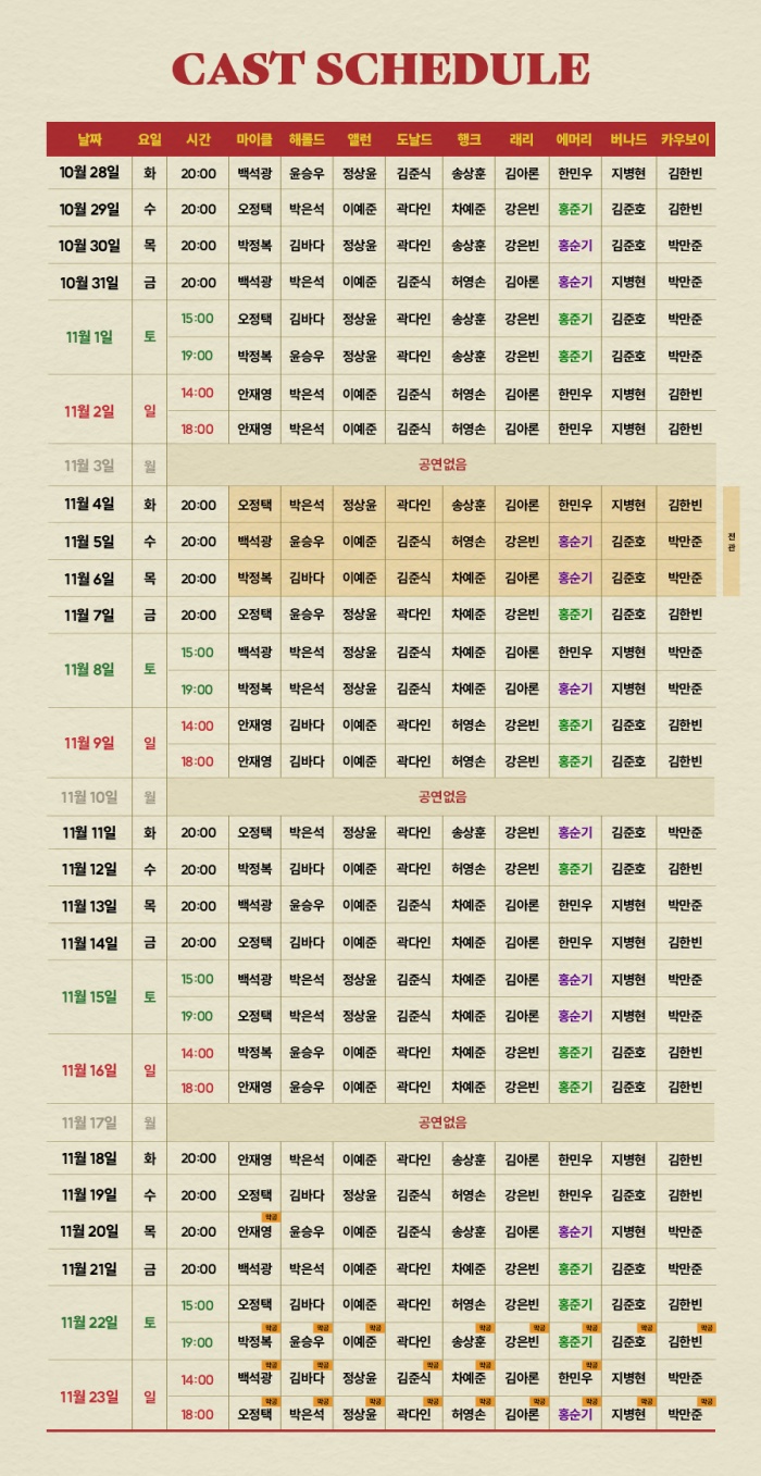- 화, 수, 목, 금 오후 8시 / 토 3시, 7시 / 일, 공휴일 2시, 6시 (월 공연없음)