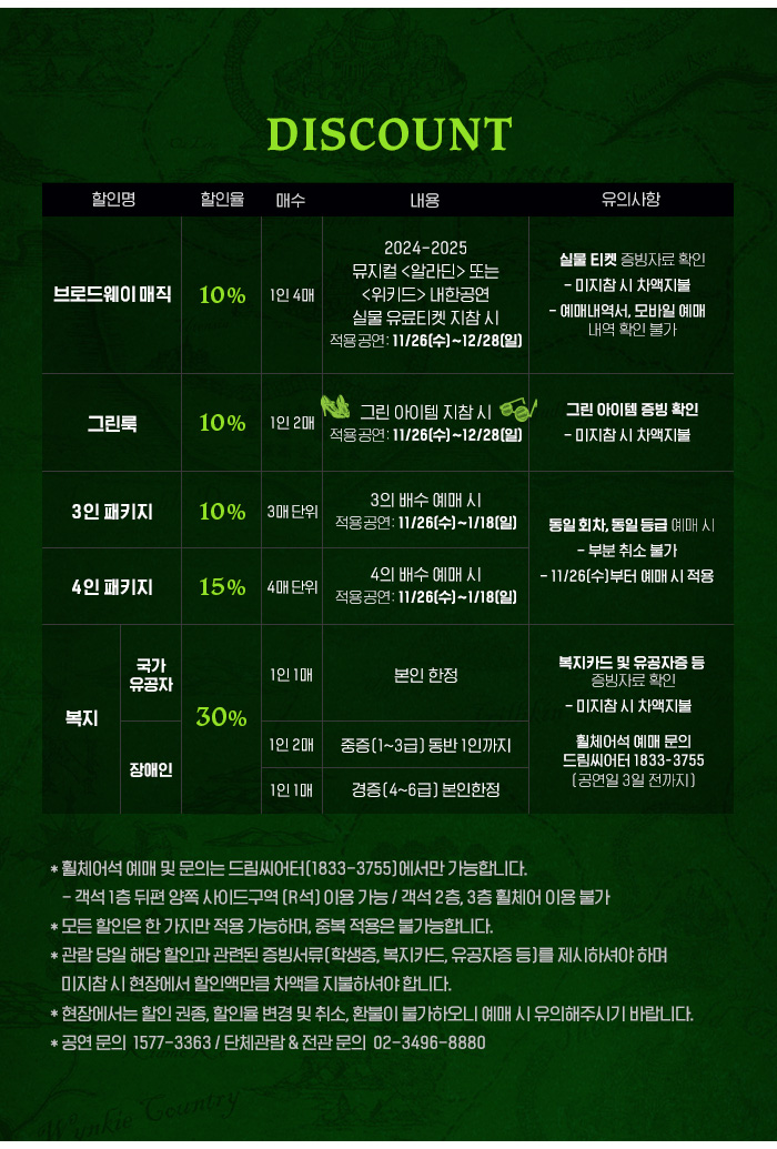 | 유효기간(이용조건) | 2025년11월13일(목) ~ 2026년01월18일(일) (예매한 공연일시에 한해 이용 가능) | ||||||||