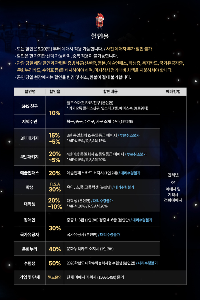 ※ 휠체어석은 기획사 전화예매만 가능합니다. (1566-5490)