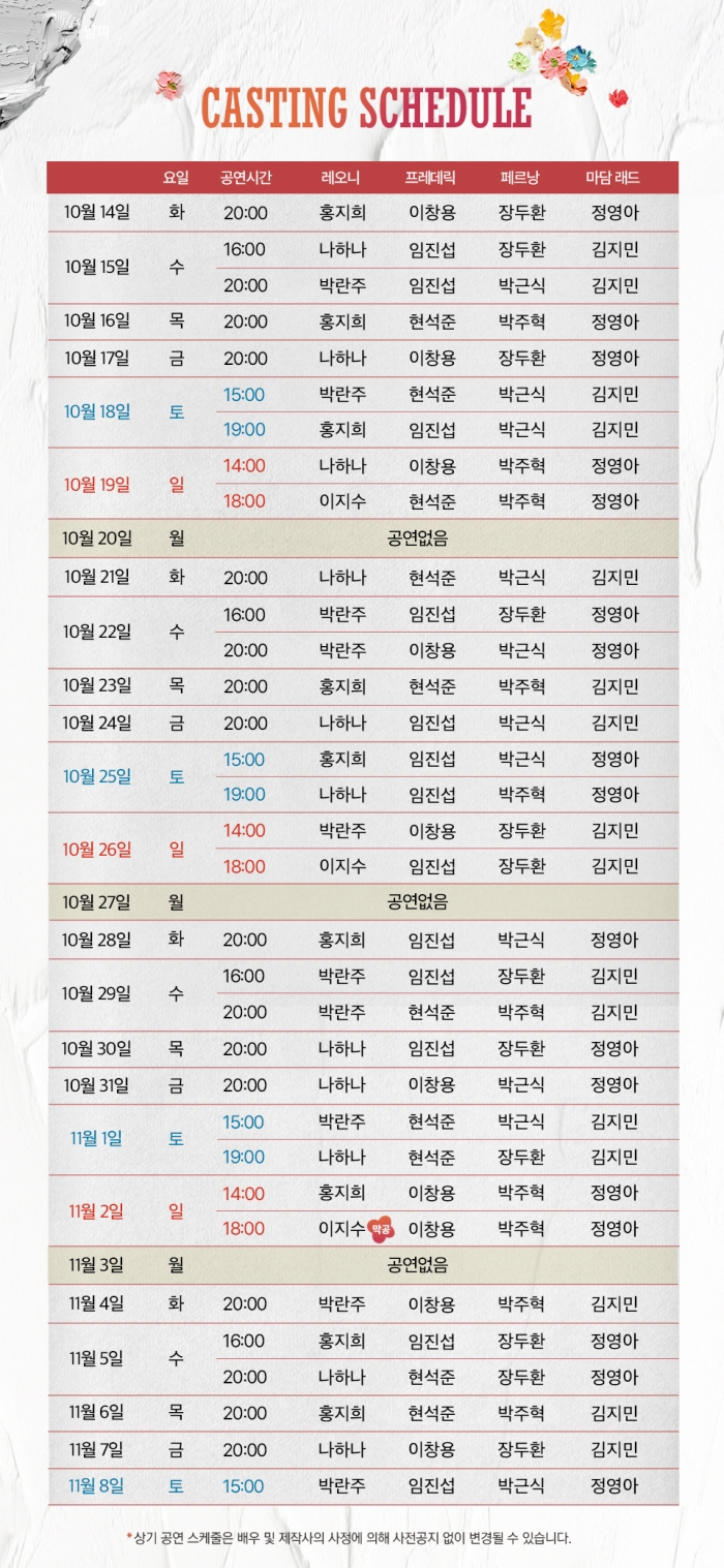 화, 목, 금 오후 8시 / 수 4시, 8시 / 토 3시, 7시 / 일,공휴일 2시, 6시 (월 공연없음)