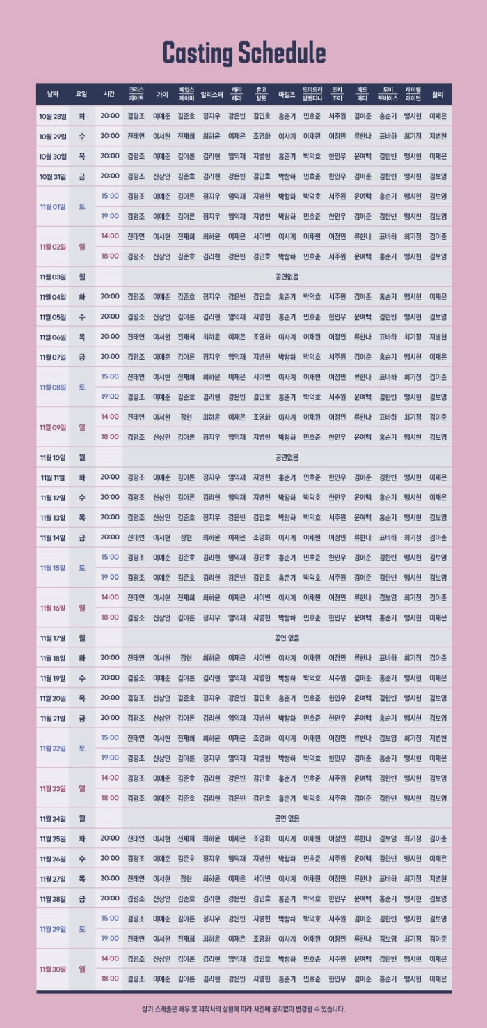 - 평일 오후 8시 / 토 3시, 7시 / 일, 공휴일 2시, 6시 (월 공연없음)