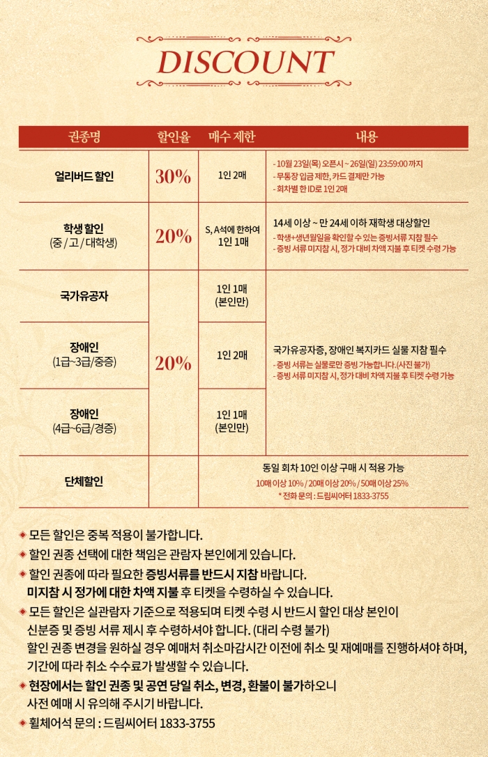 ※ 교통상황 또는 주차시간으로 인한 관람 지연 시 공연 관람의 변경 및 취소는 불가하오니, 이점 유의해 주시기 바랍니다.