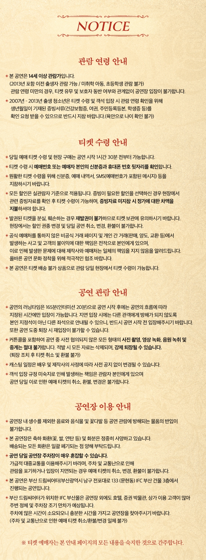 ※ 교통상황 또는 주차시간으로 인한 관람 지연 시 공연 관람의 변경 및 취소는 불가하오니, 이점 유의해 주시기 바랍니다.