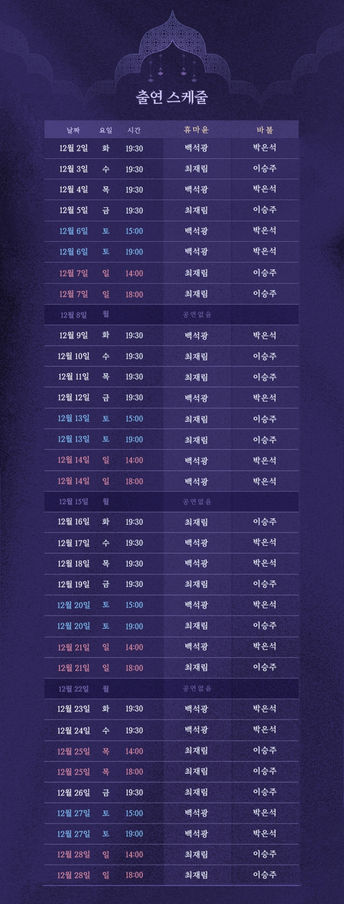 - 평일 오후 7시30분 / 토 3시, 7시 / 일, 공휴일 2시, 6시 (월 공연없음) * 12/25(목) 2시, 6시