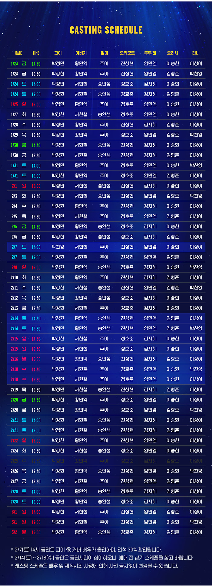 화,수,목 오후 7시 30분 / 금 오후 2시 30분, 7시 30분 / 토 오후 2시, 7시 / 일 오후 3시 (월 공연 없음)