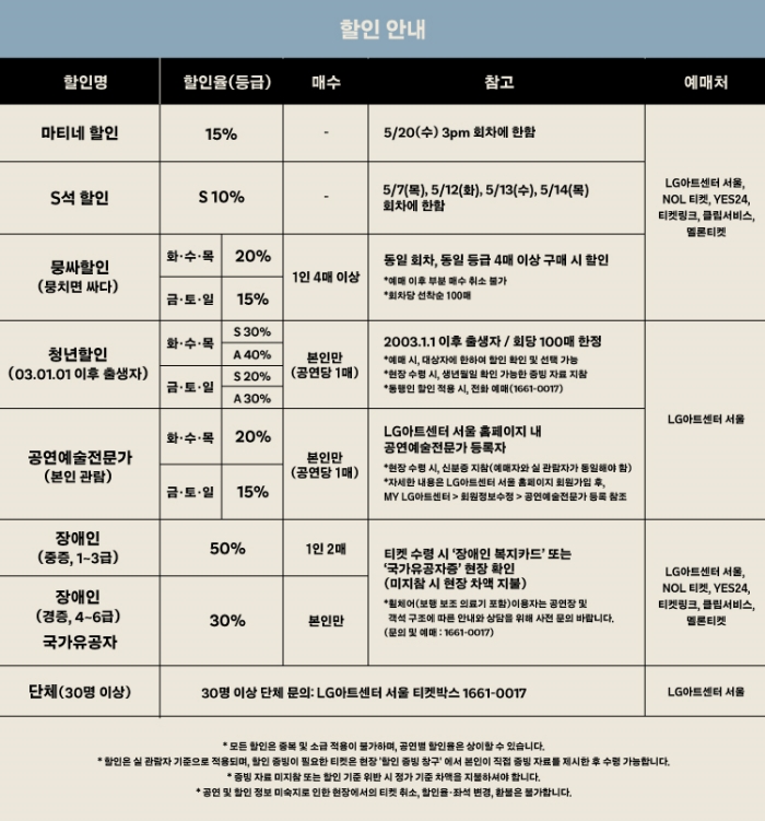 | 판매자(발행자) | LG아트센터 서울 티켓박스 | 고객문의(소비자상담) | 1661-0017 | ||||||