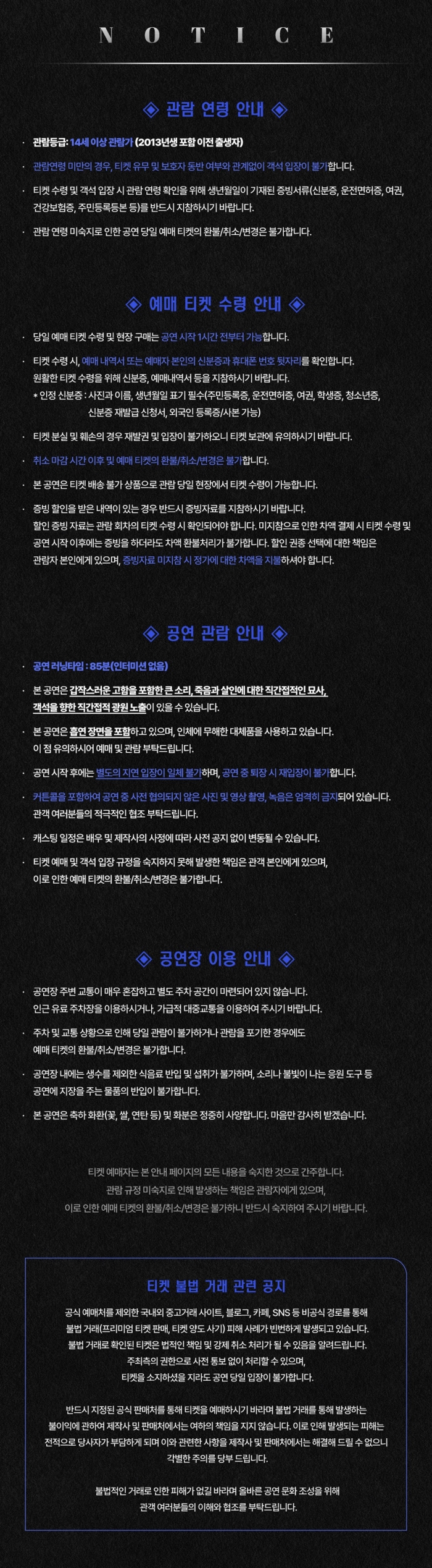 - 화~목 오후 8시 / 금 4시, 8시 / 주말 및 공휴일 3시, 6시30분 (월 공연없음)