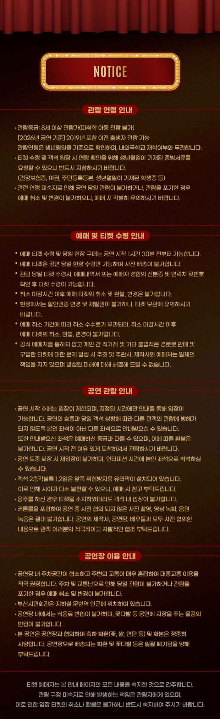 ※ 좌석배정은 회차별로 상이하며 당일 잔여석에서 예매선착순으로 배정됩니다. (좌석 지정 불가)