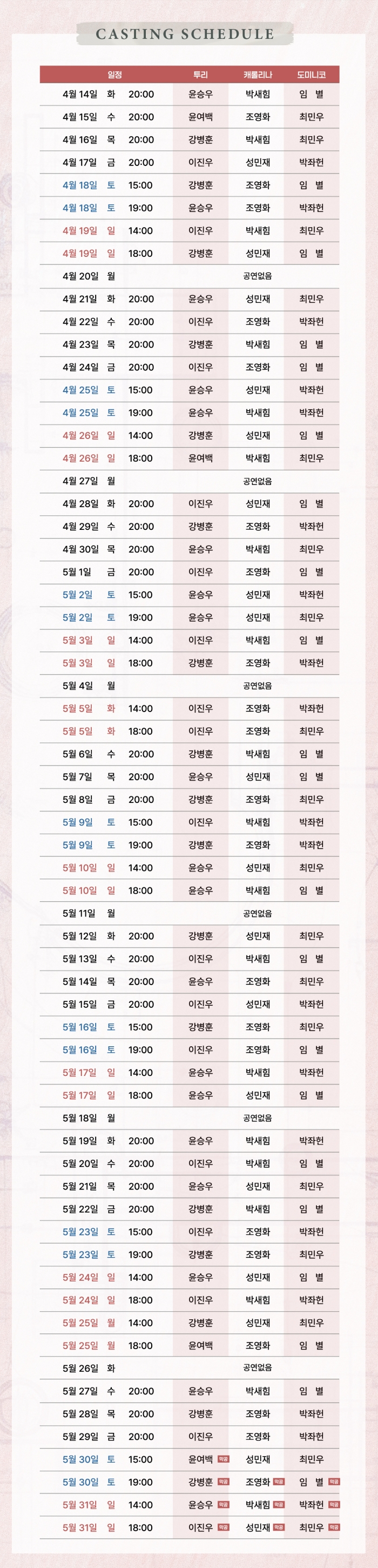 - 화~금 오후 8시 / 토 3시, 7시 / 일 및 공휴일 2시, 6시 (월 공연없음)