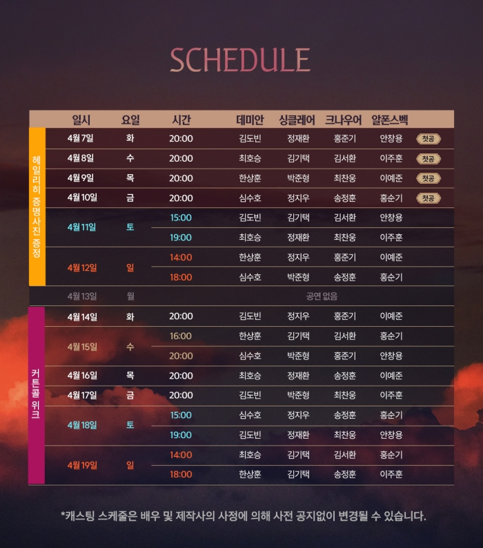 - 화, 목, 금 오후 8시 / 수 4시, 8시 / 토 3시, 7시 / 일, 공휴일 2시, 6시 (월 공연없음)