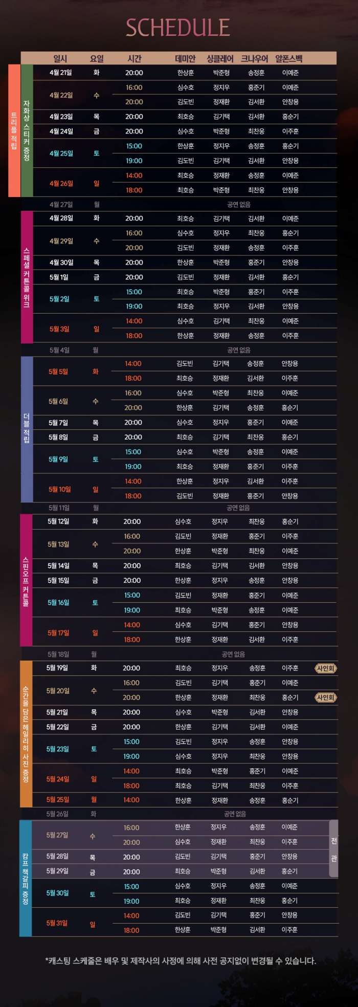 - 화, 목, 금 오후 8시 / 수 4시, 8시 / 토 3시, 7시 / 일, 공휴일 2시, 6시 (월 공연없음)