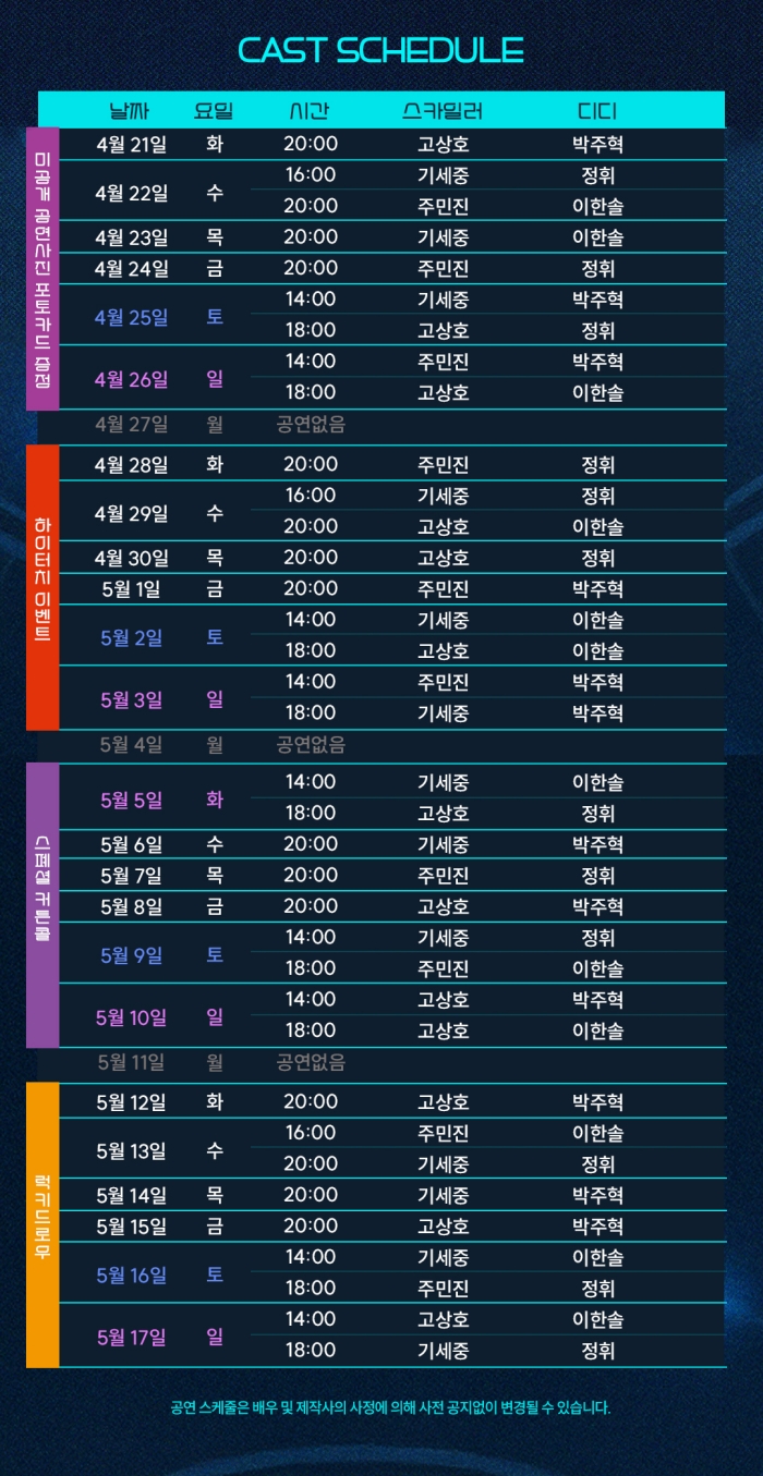 - 화, 목, 금 오후 8시 / 수 4시, 8시 / 토 일, 공휴일 2시, 6시 (월 공연없음)