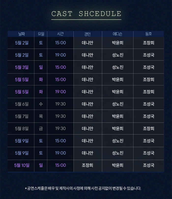 평일 오후 7시30분 / 토 공휴일 3시, 7시 / 일 3시 (월 공연없음)